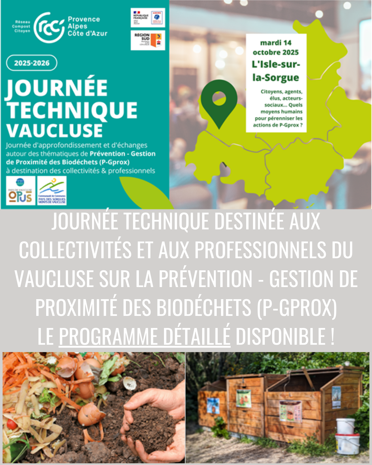 Le réseau régional de la prévention-gestion de proximité des biodéchets a le plaisir de vous proposer, en collaboration avec la Communauté de Communes Pays des Sorgues Monts de Vaucluse et l'association Opus labelisée CPIE des Pays de Vaucluse, la deuxième Journée Technique Biodéchets